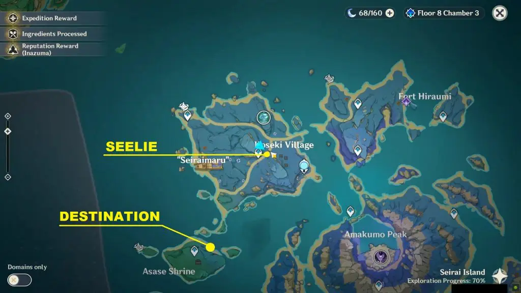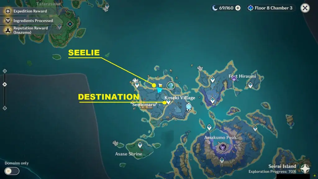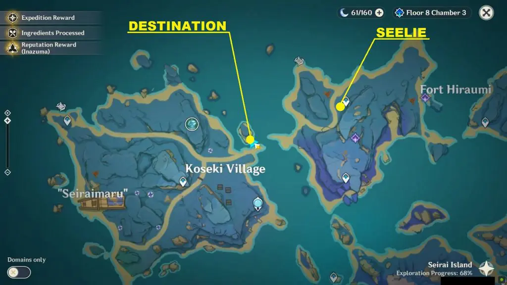 This Seelie is north of Seiraimaru Ship as shown in the picture below. Chase the Seelie to its destination, which is near Koseki Village’s fast travel point, to get a common chest.