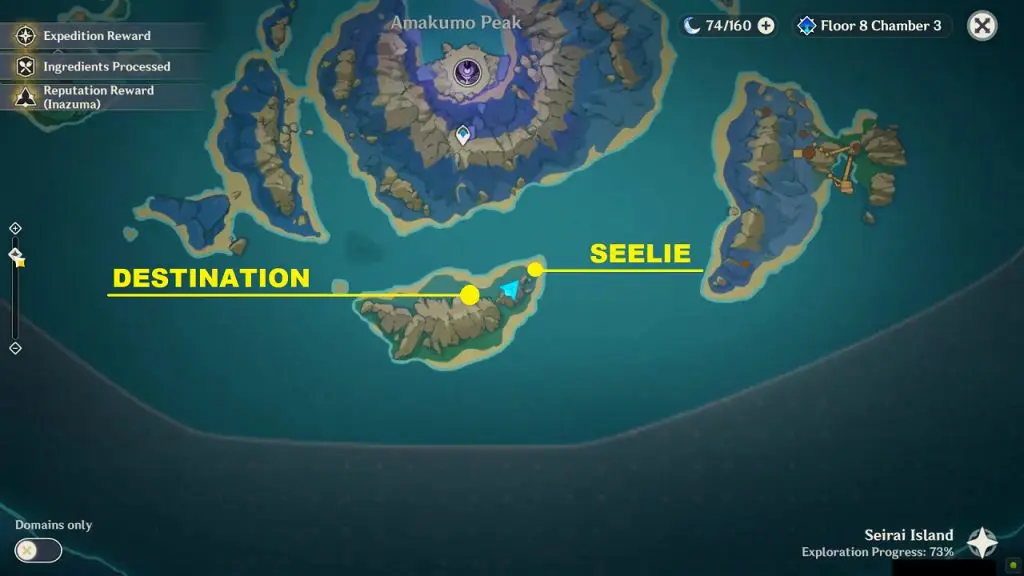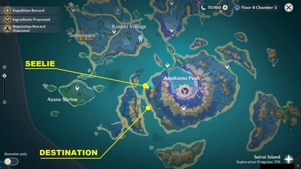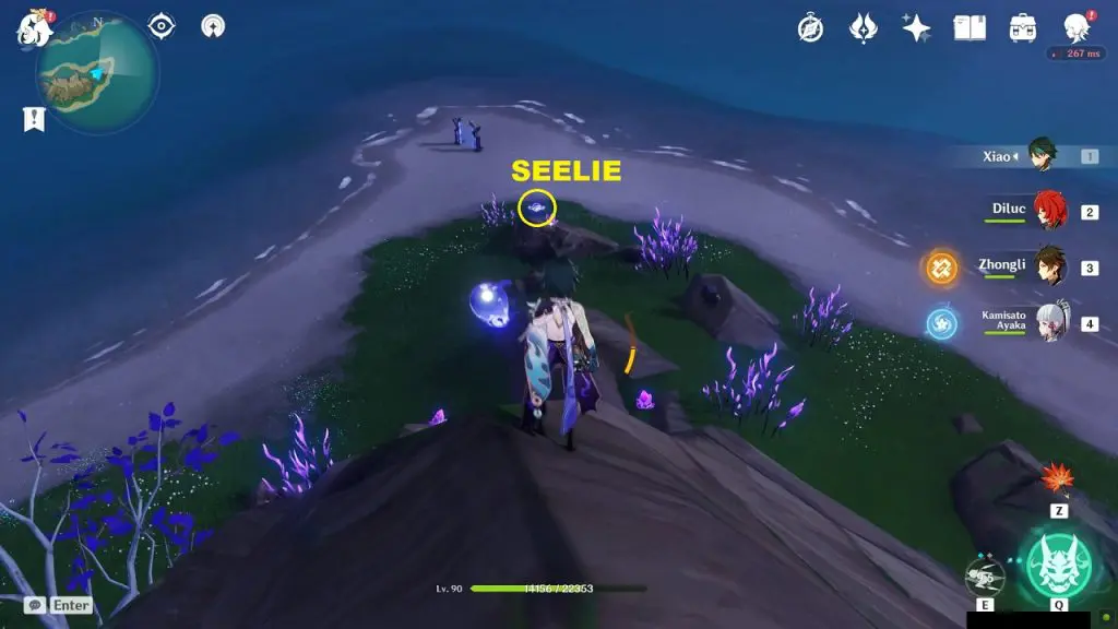 This Seelie is on the beach west of Amakump Peak. Chase the Seelie to its destination as shown in the picture below to get a common chest.