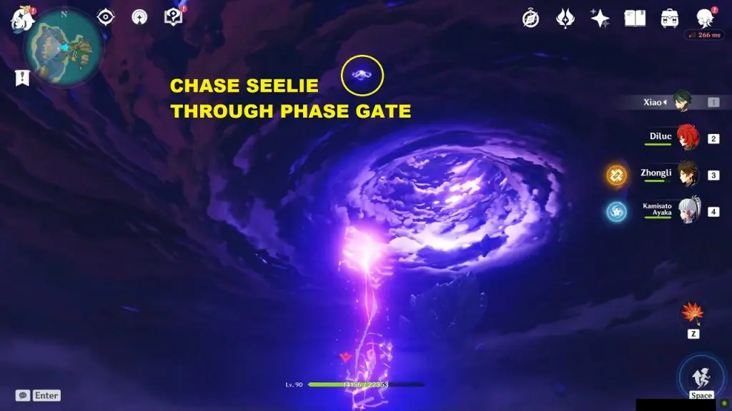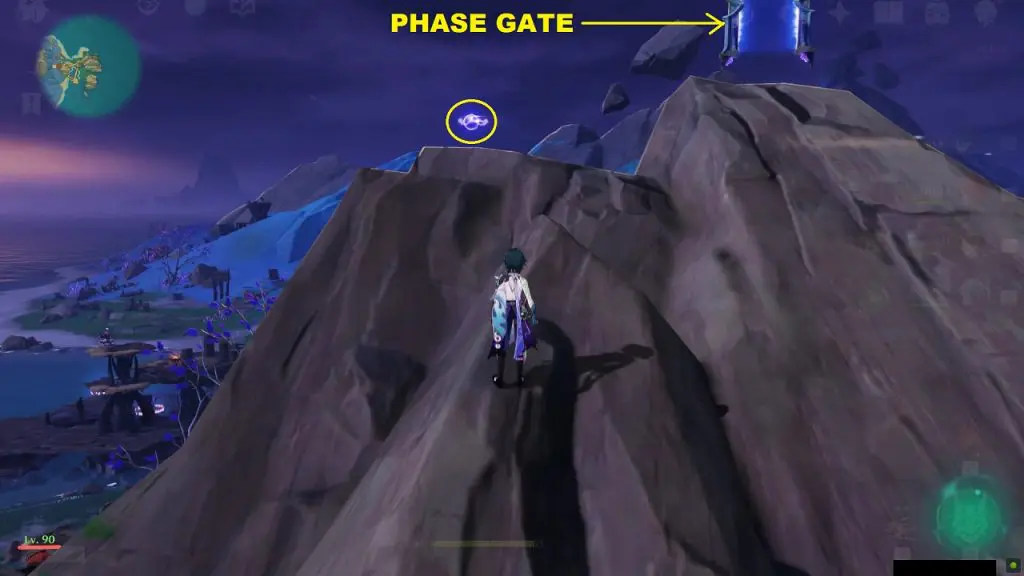 The Seelie is on the top of the mountain at the southeastern edge of Serai Island. Near the Seelie, you will find a Phase Gate. On approaching the Seelie it will pass through the Phase Gate and go up in the air. Go through the Phase gate and chase the Seelie up in the air. As you reach the Seelie, it will run away to the top of the mountain at the center of this small Island as shown in the picture below.