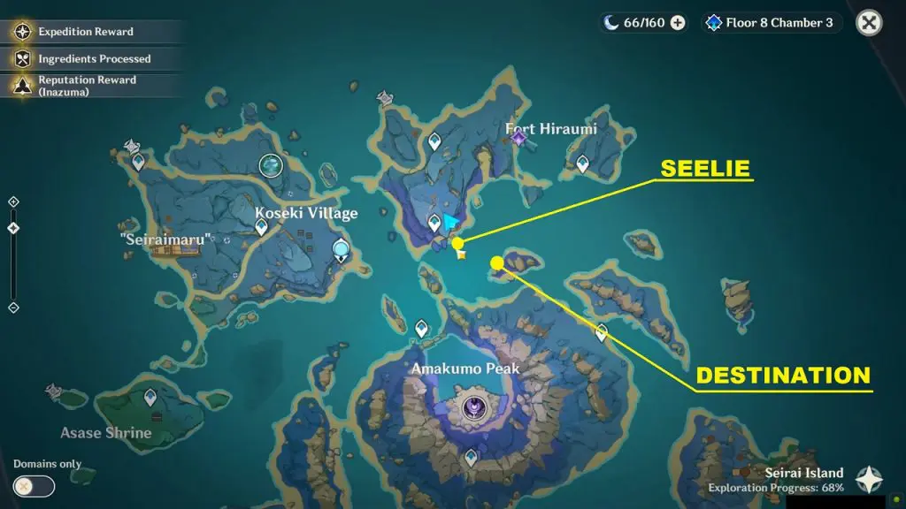 This Seelie is in Seiraimaru Ship, which is on the western edge of Seirai Island as shown in the picture below. The Seelie will lead you through various puzzles in the area. Click here to check the complete walkthrough of Seiraimaru Ship. In the end, the Seelie will lead you to the Ship Deck, where you will find the Seelie Court.