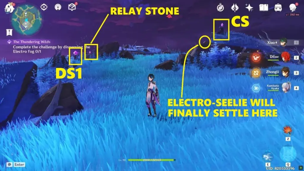 This Seelie is used to solve a Relay Stone Puzzle. This puzzle contains 3 discharge stones (DS), 1 cumulation stone (CS), and 2 relay stones (RS). The cumulation stone is on top of the large rock in the center. It is surrounded by three discharge stones. A relay stone is at the base of the rock (above which the CS is present). Another relay stone is near one of the discharge stones. Pick up both these relay stones. To solve the puzzle, you’ve to connect the CS to all three DS.