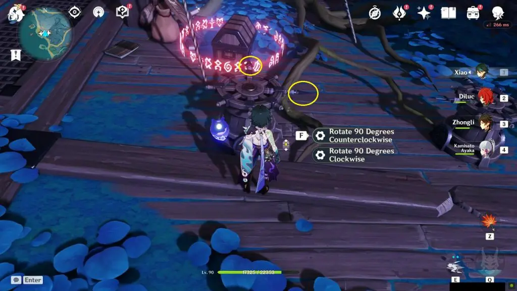 On the Ship’s Deck, you will find a sealed Exquisite chest with four rotating helms around it. Each helm will have two arrows pointing out as shown with yellow circles in the below picture. This puzzle is very easy. Rotate all the four helms in such a way that the arrows are facing each other (See the second picture below). Solving the puzzle not only unseals the chest but also breaks a wall of the ship, creatinge a way to go inside.