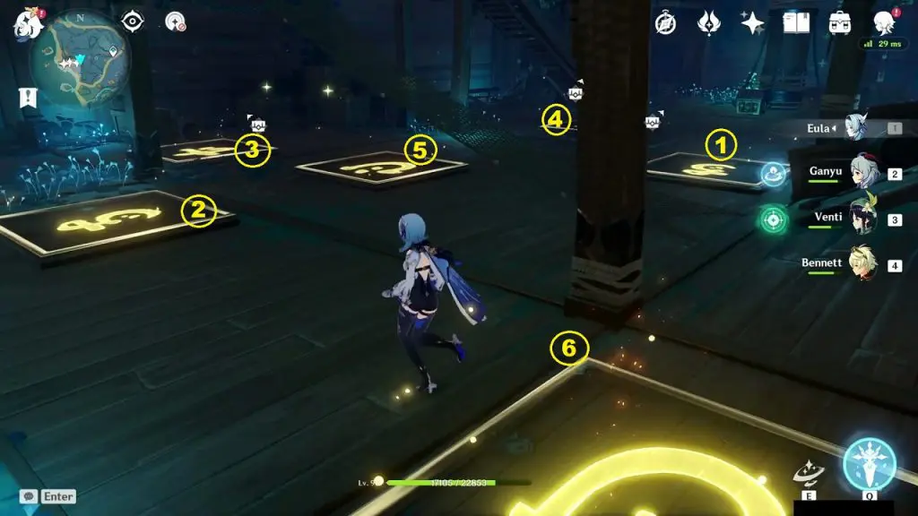 On the floor of the ship, you will find a set of tiles that glows when you step on them. Step on the six tiles in the sequence as shown in the picture below to unseal the exquisite chest. Solving the puzzle not only unseals the chest but also creates a hole on the ship floor, creating a way to the bottom level.