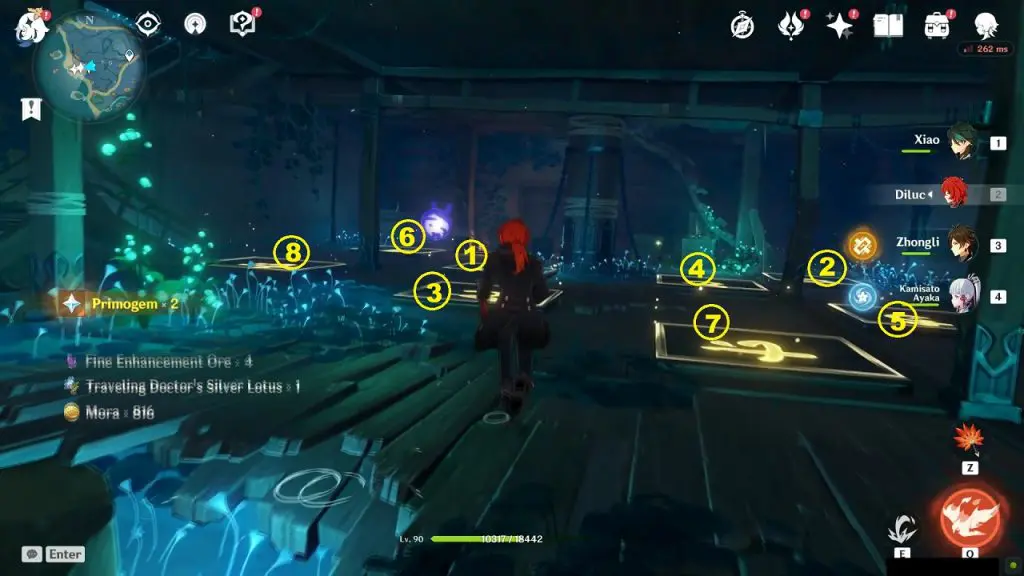 On the bottommost floor of the ship, you will find a set of tiles that glows when you step on them. Step on the eight tiles in the sequence as shown in the picture below to unseal the exquisite chest. Solving the puzzle not only unseals the chest but also breaks the eastern wall of the ship leading to a Relay Stone Puzzle.