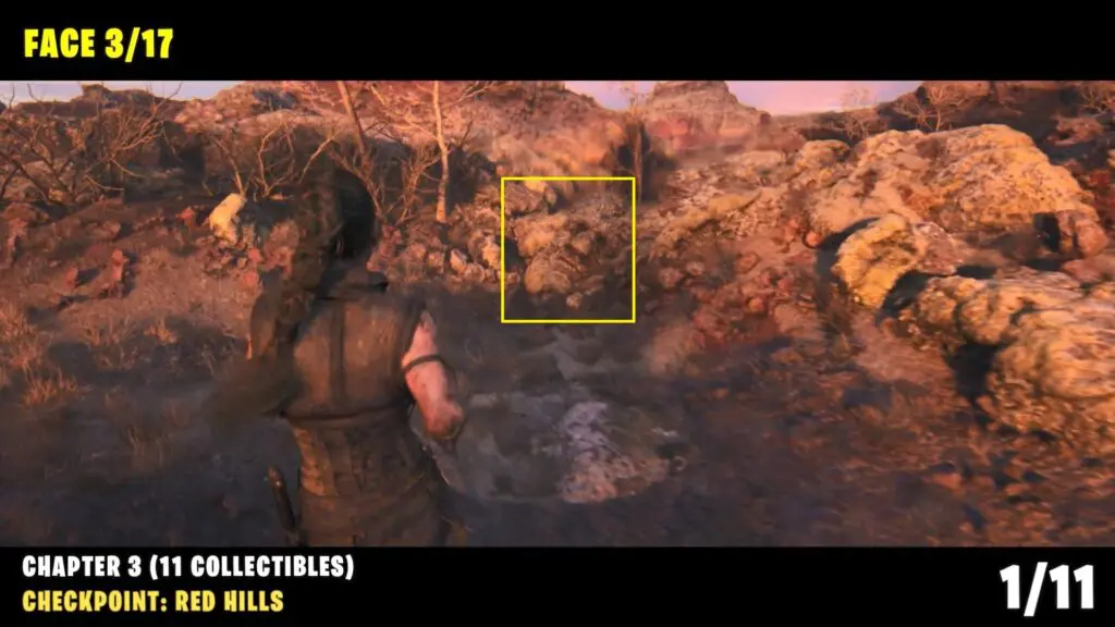 At the very start of chapter 3, the player will reach a destroyed village. After going down the hill, go in the left direction and then go behind the broken house area to locate the stone face at the end.