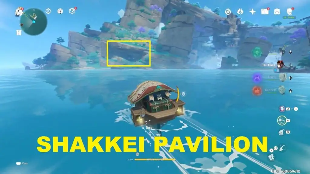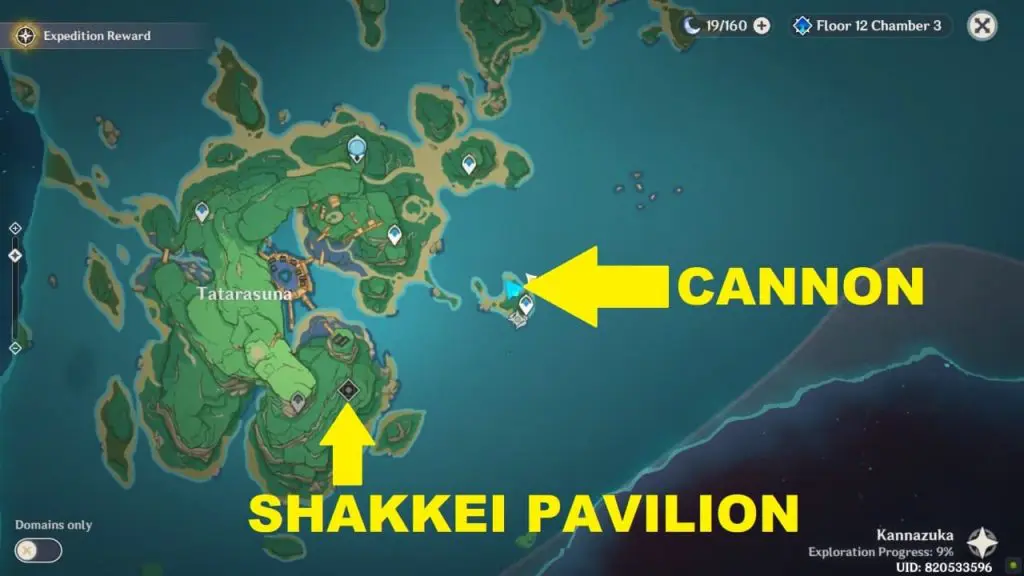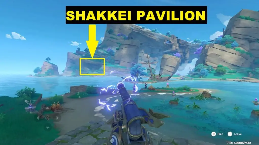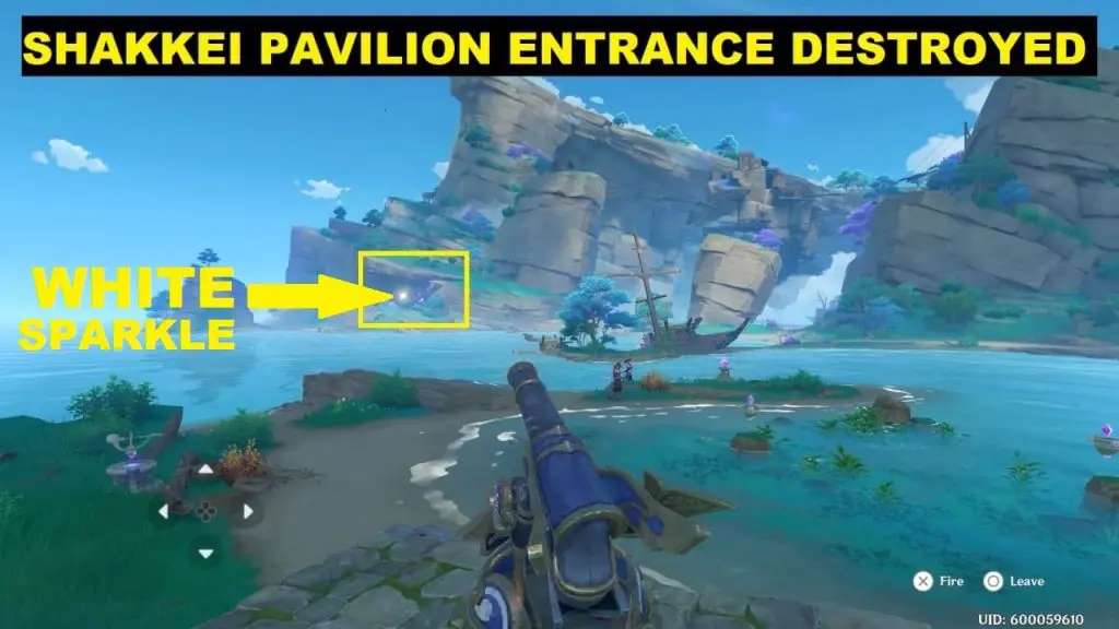 To unlock the Shakkei Pavilion’s entrance get to the cannon which is on the island to the east of Tatarasuna. You can use this cannon to blow-open the entrance to the Shakkei Pavilion Domain. [NOTE: You must be affected by Electro or carrying an electrogranum to be able to operate the cannon.] The electrogranum plant is on the right side of the cannon. Summon an electrogranum, activate the cannon and destroy the Shakkei Pavilion Entrance (check the images below). If you successfully destroy the Shakkei Pavilion Entrance, you’ll see a white-sparkle after the cannon-ball blast; and an achievement “Jackpot” will also get unlocked.
