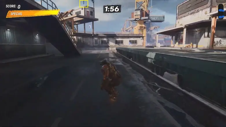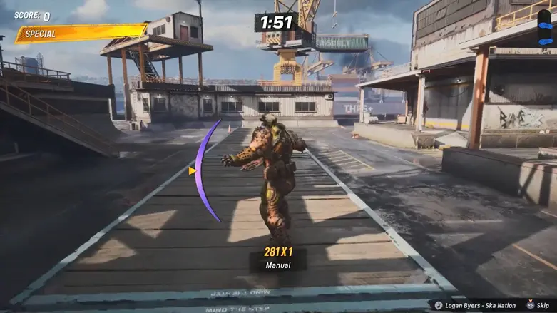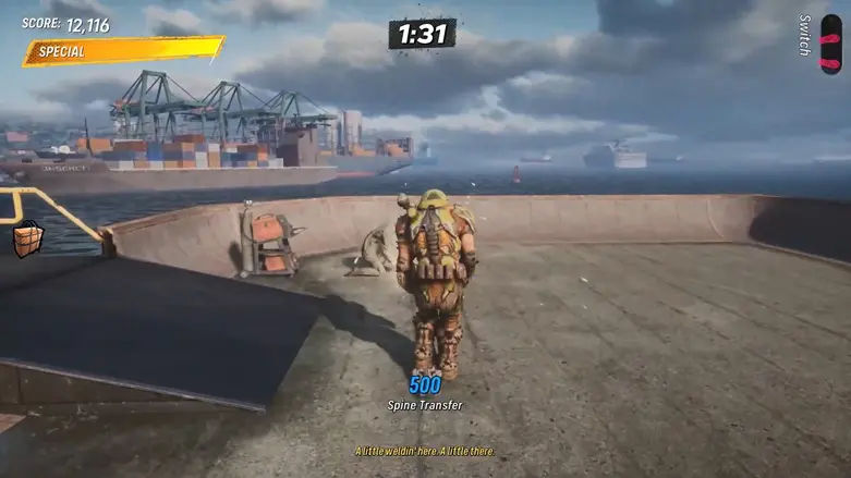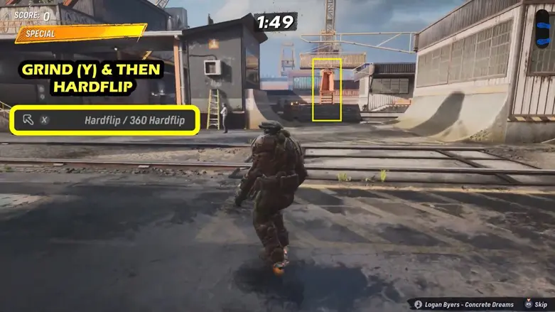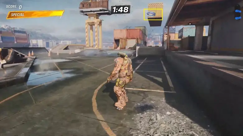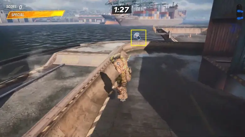 Use the sides nearby like a quarter pipe to launch yourself into the moving container. Once inside, use the quarter pipe there to launch upward and grab the logo floating above.