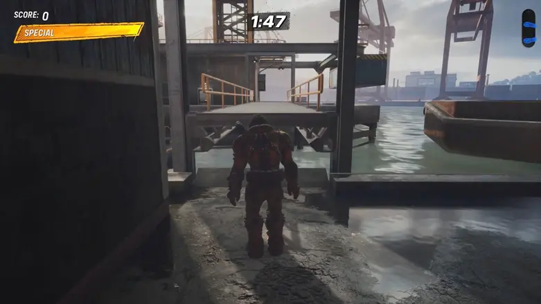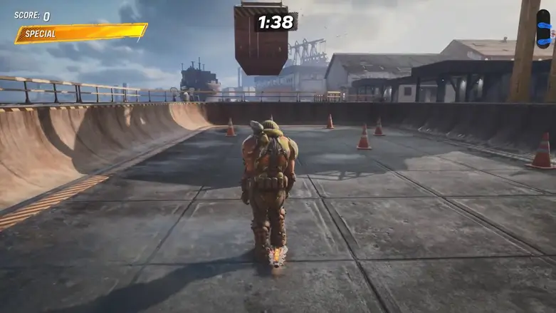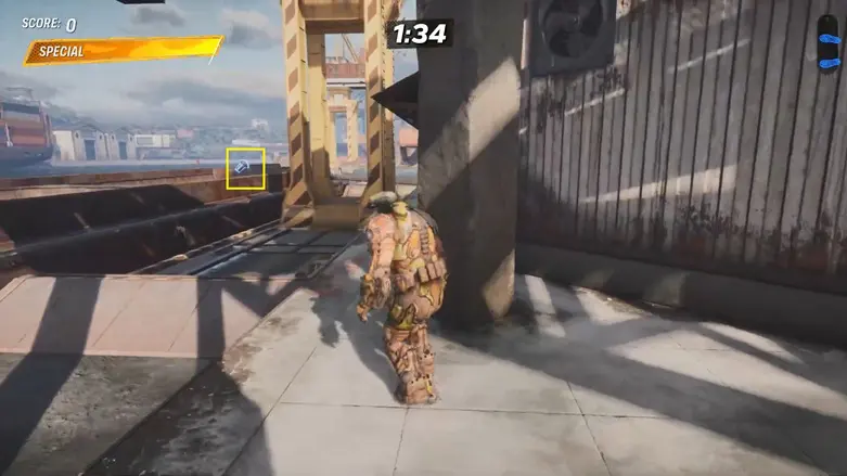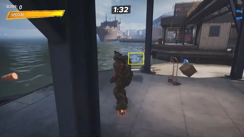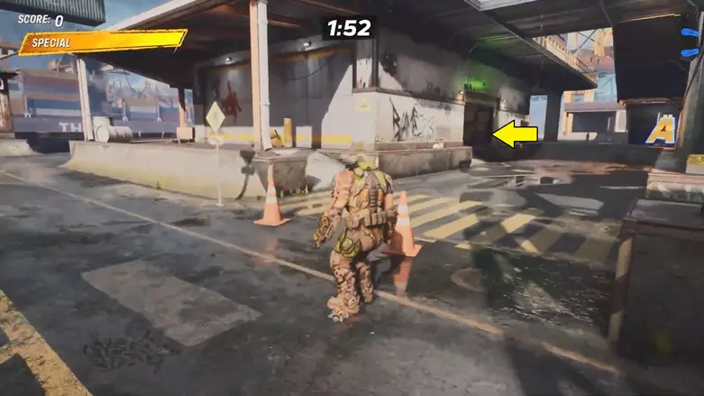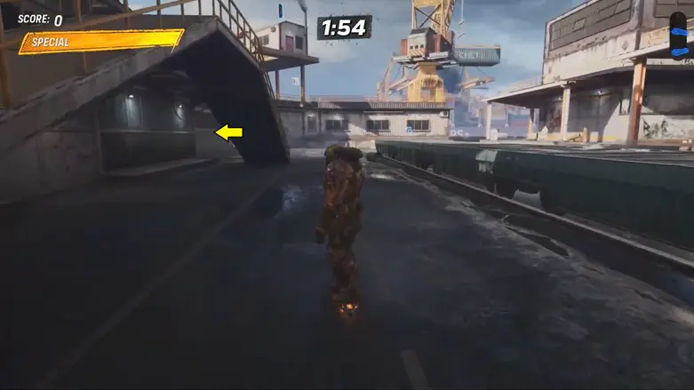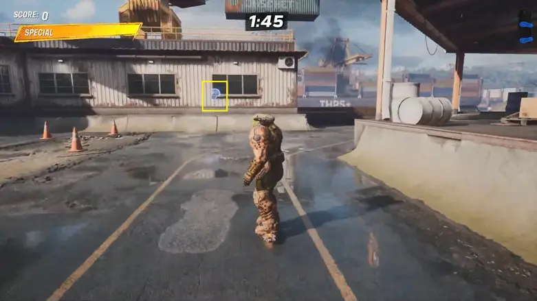 From the starting location, go left and follow the path to the area with the shipping containers. Go behind the containers, and you’ll see a large container moving back and forth in the air above some traffic cones.