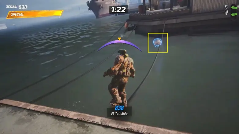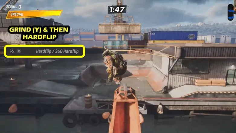 Aim to grind the metal rail around the very top of the buoy. While you’re in the air before landing the grind, make sure to perform a Hardflip.