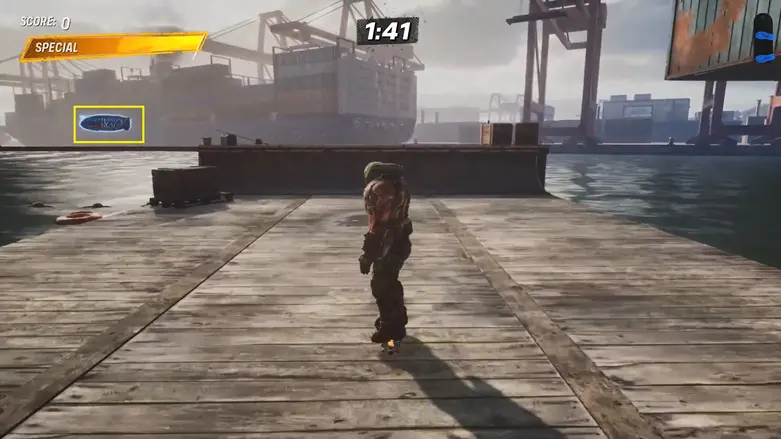 To get it, go behind the building and jump onto the boat in the water. Use the sides of the boat like a quarter pipe to build up speed. Then launch up to the platform above the boat, grind to the right, and grab the Hidden Deck.