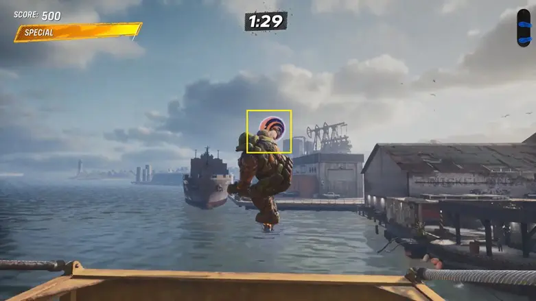 To complete this goal, you need to use the nearby ramps or quarter pipes to build up speed, then launch yourself toward the buoy.