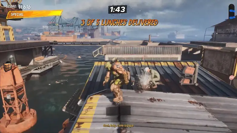 To complete the goal, first get the lunch orders from the delivery guy. Then, deliver the lunch boxes to 5 different welders working around the shipyard.