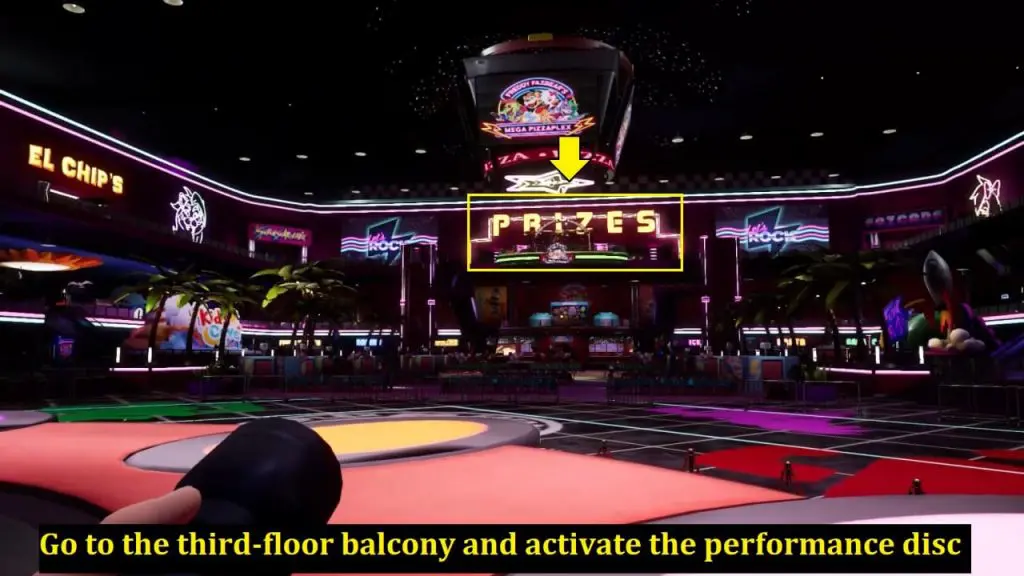 As the mission starts at the fourth level, you simply need to follow Freddy up to the Main Stage. Once you reach the stage, Freddy will tell you that you need to go to the third-floor balcony and activate the performance disc.