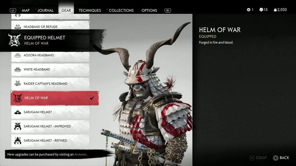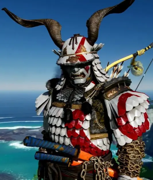 As you draw the sword in front of the shrine, a cutscene will trigger and you will be automatically equipped with the God of War Armor. The reward from the Shrine is an easter egg referencing the ‘God of War’ game. When the cutscene finishes you will earn three God of War Themed items: Helm of War, Spartan Face Mask, and Ghost of Sparta cosmetic for the Sakai Clan Armor. Wearing the items make you look like Kratos from the ‘God of War’ game. See the picture below with the three items equipped.