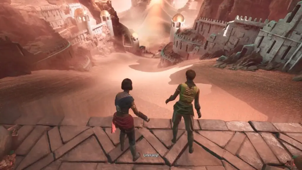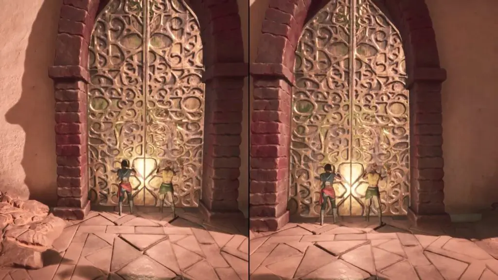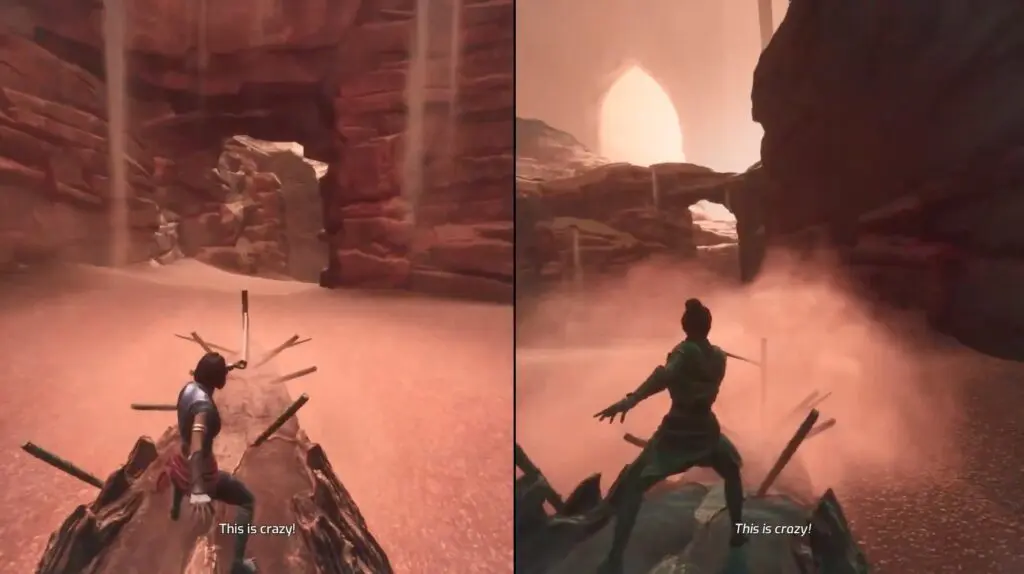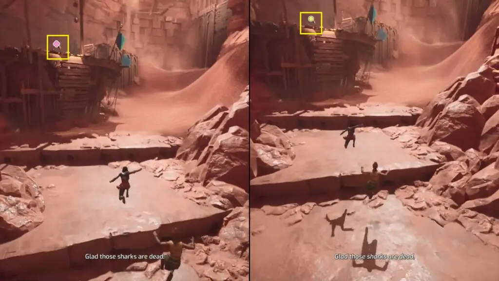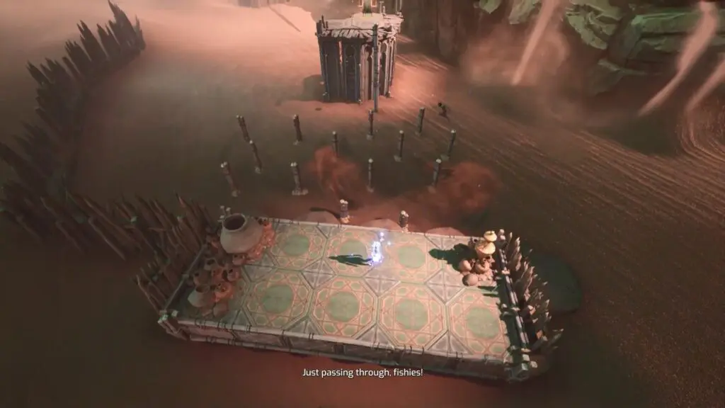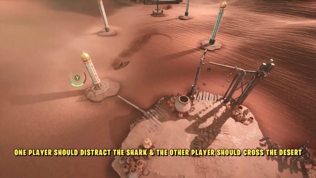 Now, Mio and Zoe will reach a part of the quest where they must cross a sandy area filled with sandfish. These fishes are dangerous because they can sense movement and attack. To safely get across, they need to distract the sandfish. To do this, make one player to use the Tower Thump to create a loud noise. When the sandfish hear the sound, they will be drawn toward it, giving the other player a chance to quickly run to the next platform.