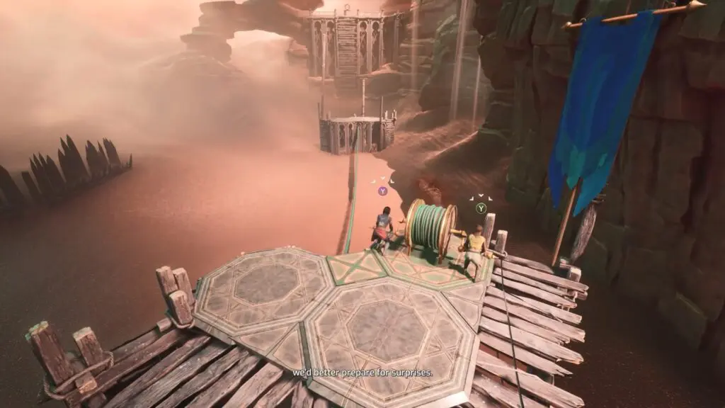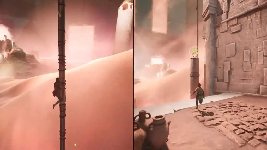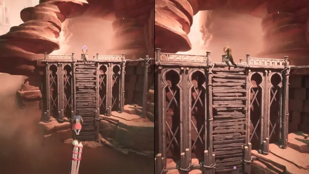 As the side quest begins, have Mio and Zoe slide down the sandy slope. Once they reach the bottom, move forward and climb up the wooden ledge on the left. After reaching the top, look for the grappling and use it to swing across to the next platform.