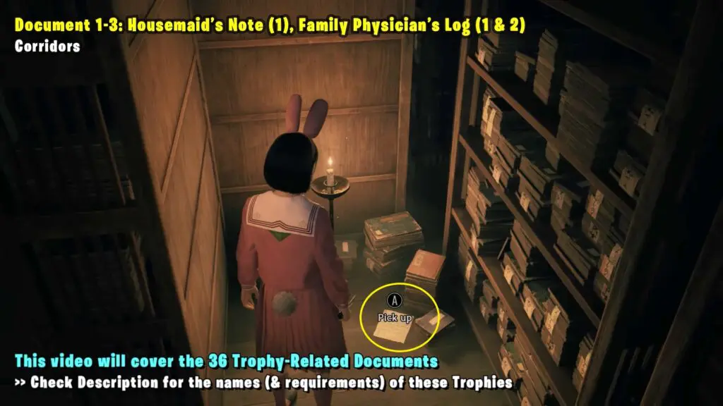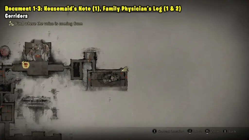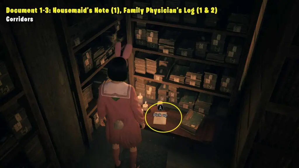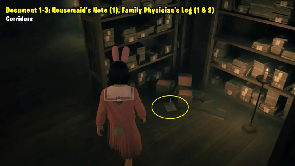 Housemaid’s Note (1) is found on the floor inside the Library in the Corridors area. Family Physician’s Log (1) is on a coffee table in the Corridors area. Family Physician’s Log (2) is on the floor in the Corridors area.