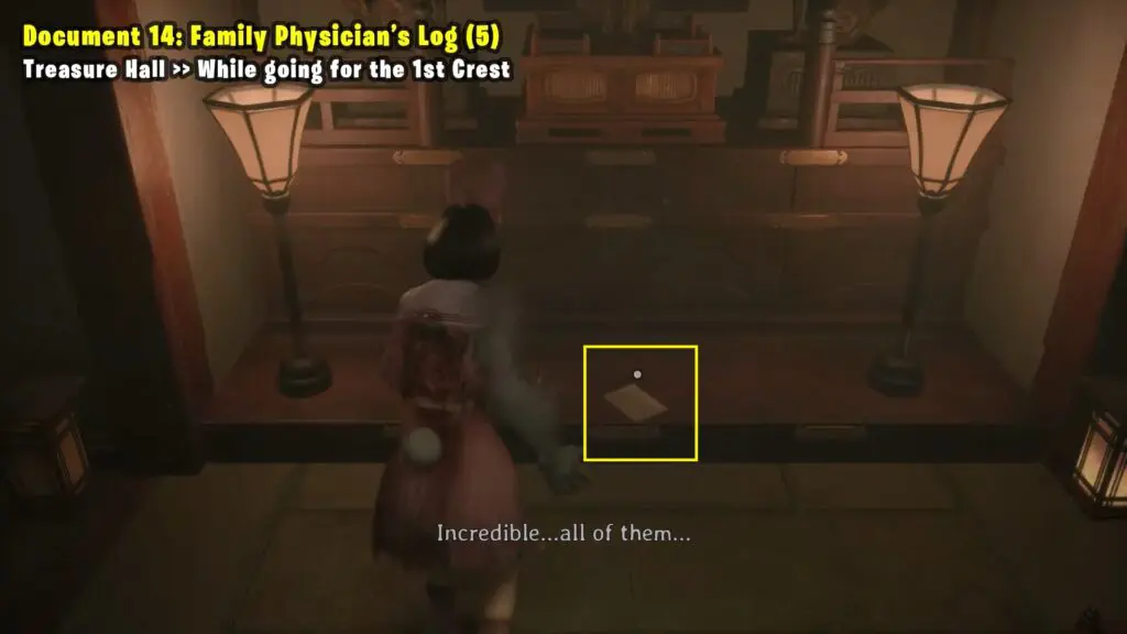 After opening the first door in the F1 of the Main hall, turn left to find the Family Physician’s Log on a bench.