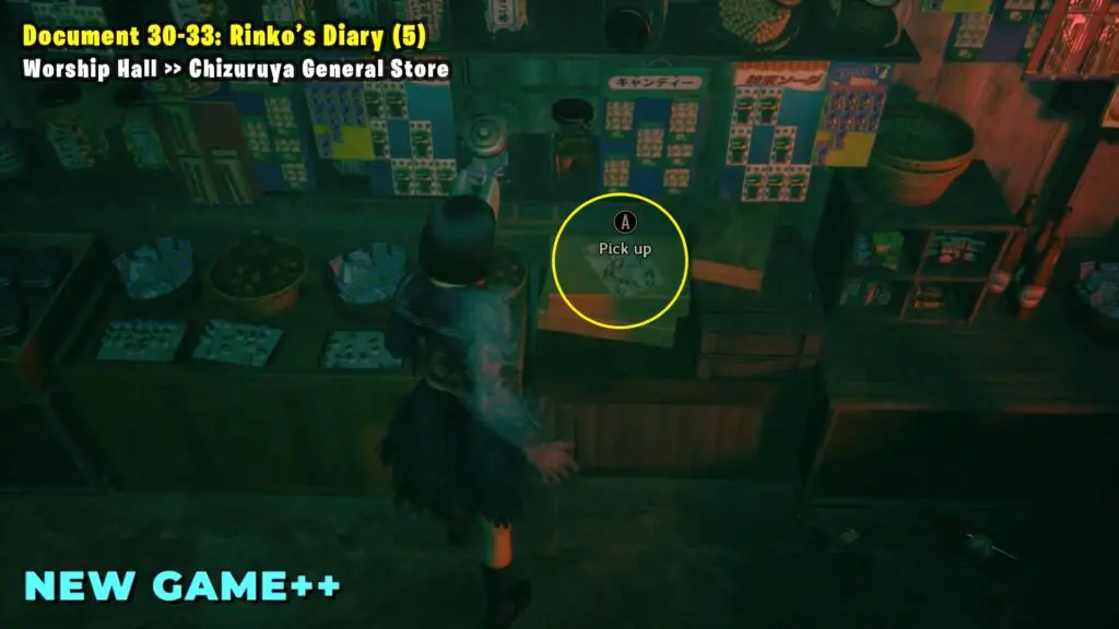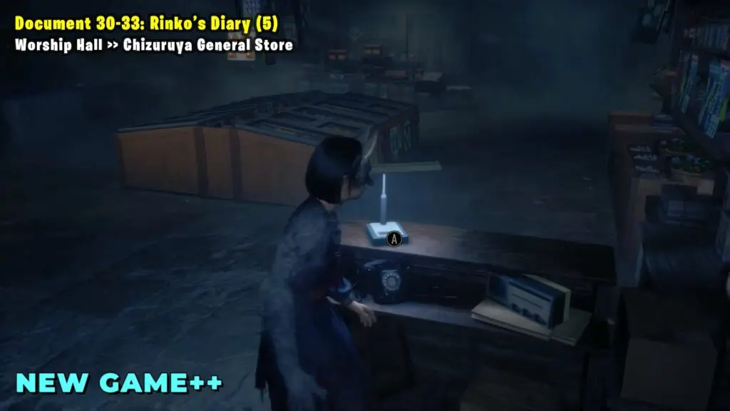 Go to the Chizuruya General Store (southern room). Use the desk lamp to turn the room red, then you’ll find Rinko’s Diary on a table.
