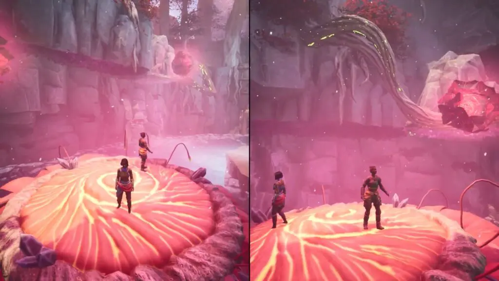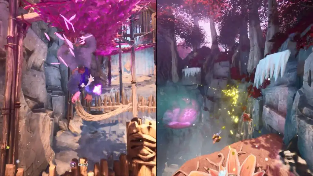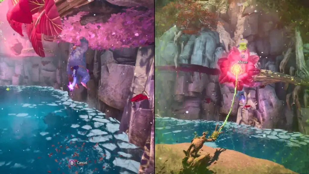 Smash the flower to lower it, creating a platform for Zoe to climb on top. Once both players are on the flower, it will begin to grow automatically, lifting them and transporting them to the next level.
