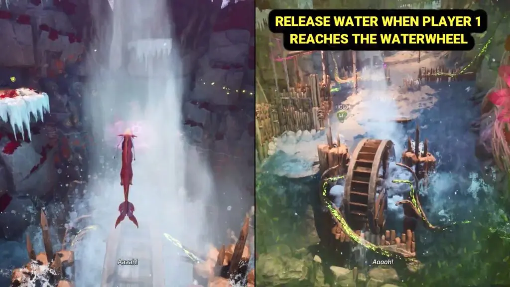 Now, transform Mio into her fish form and swim toward the waterwheel. Once Mio reaches the top of the waterwheel, release the water flow. The strong current will launch fish Mio into the air, landing her on the platform ahead.