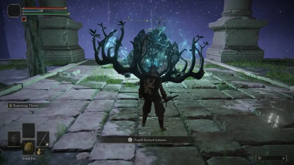 After lighting all the eight flame pillars, fast travel to the Siofra River Bank Site of Grace. You will notice that all the eight torches near the stairs leading to the horned remains are lit. Climb the stairs to reach the horned remains. then interact with it to start the Ancestor Spirit Boss fight.