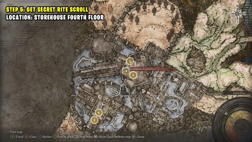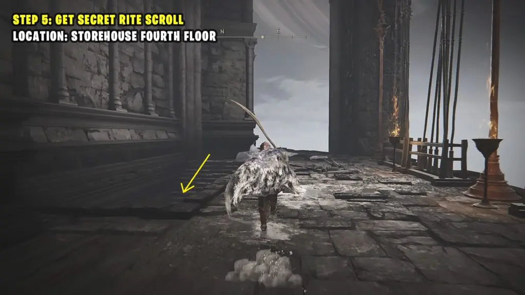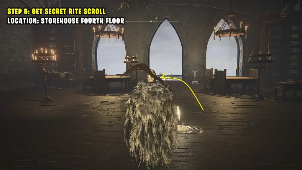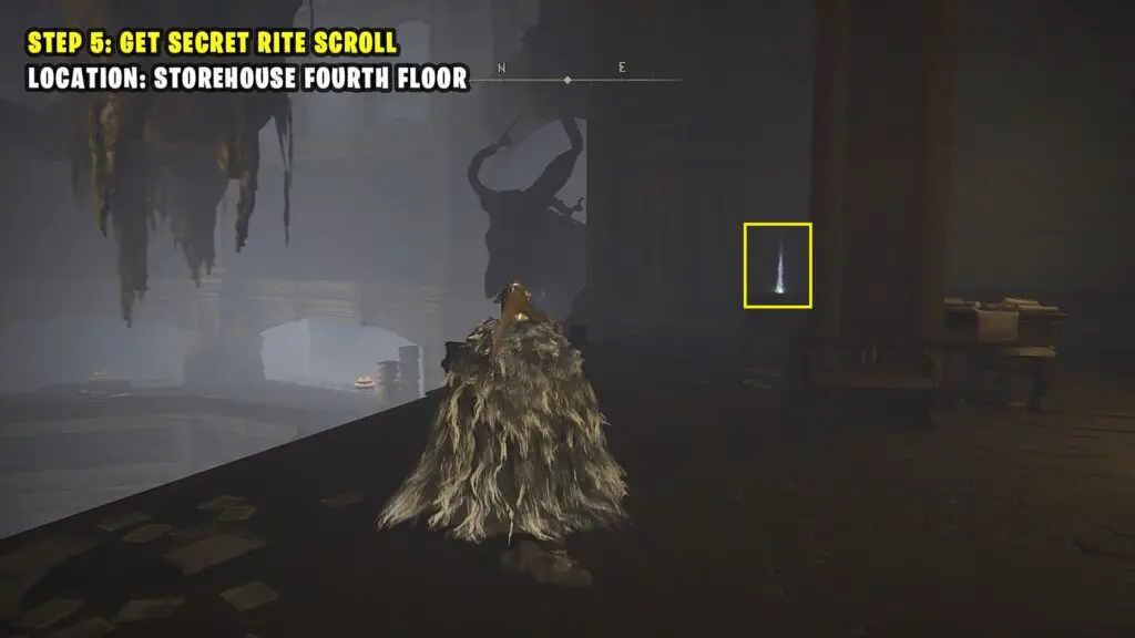 Proceed ahead and climb up the stairs. This will take you to an area with many boats. Climb up the stairs there on the east side. Proceed ahead and go down the stairs as shown in the picture below. Then turn right and you will find the Secret Rite Scroll on a table in the next room as shown in the second picture below.