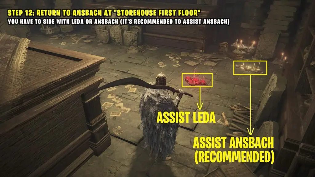 Go back to Ansbach’s location at Storehouse, First Floor in the shadow keep. Ansbach won’t be there, but you will get the option to Assist Ansbach or Leda in their fight as shown in the picture below. It is recommended to Assist Ansbach as he will help you in the final boss fight. The outcomes for both choices are shown in each step of the article below.