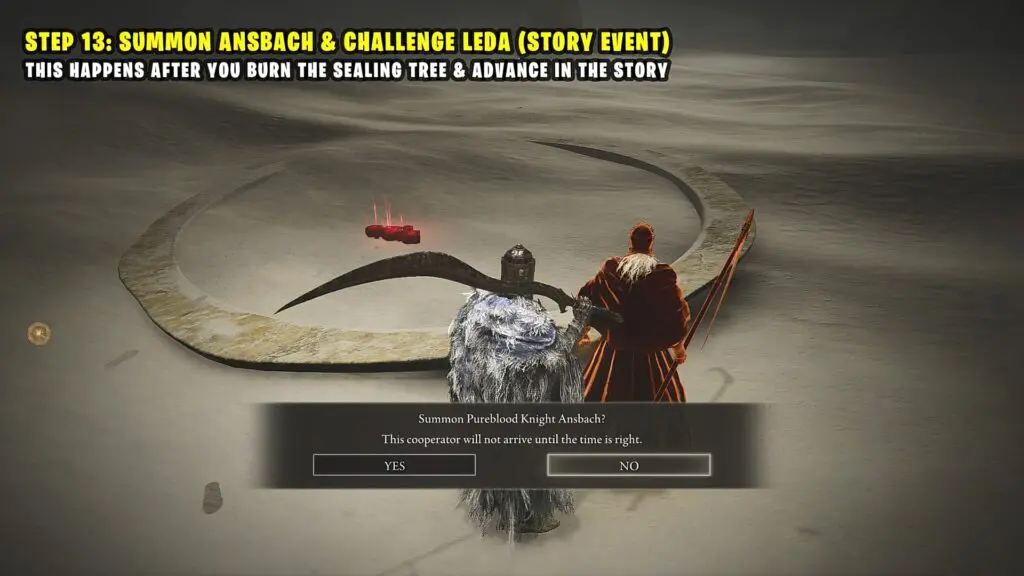 Progress in the main story and burn the Sealing Tree. This is the point of no return and most of the NPCs will disappear after this. Advance in the story and you will have to fight Leda just before the final boss fight of the DLC. You will have to face Leda irrespective of whether you assisted her or not against Sir Ansbach. If you assisted Sir Ansbach in Step 12 before, then you will be able to summon him for this fight as shown in the second picture below. On defeating Leda, you will get Leda’s Sword. Collect Freyja’s Greatsword, Freyja’s Helm, Freyja’s Armor, Freyja’s Gauntlets, and Freyja’s Greaves from her corpse in the area. Collect Falx Sword, Caterpillar Mask, Braided Cord Robe, Braided Arm Wraps, and Soiled Loincloth from another corpse in the area. Also, collect Dane’s Footwork and Leda’s Armor from another two corpses.