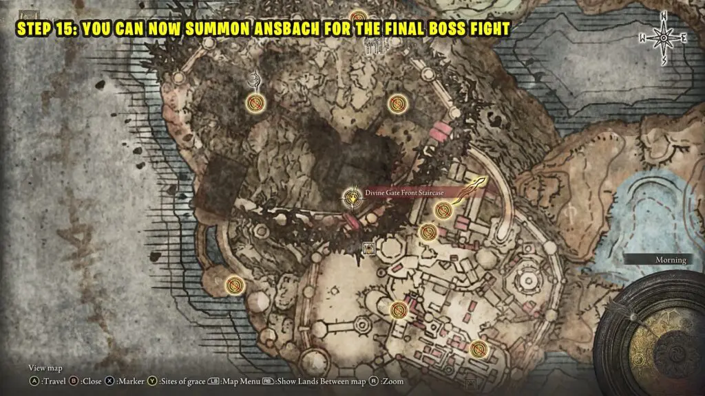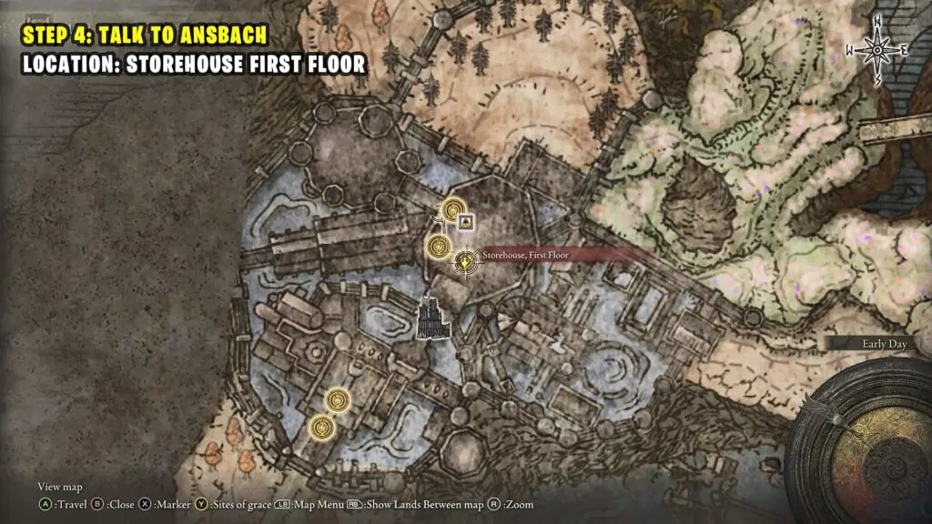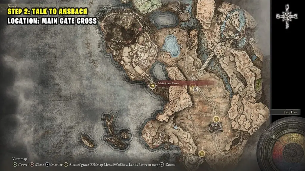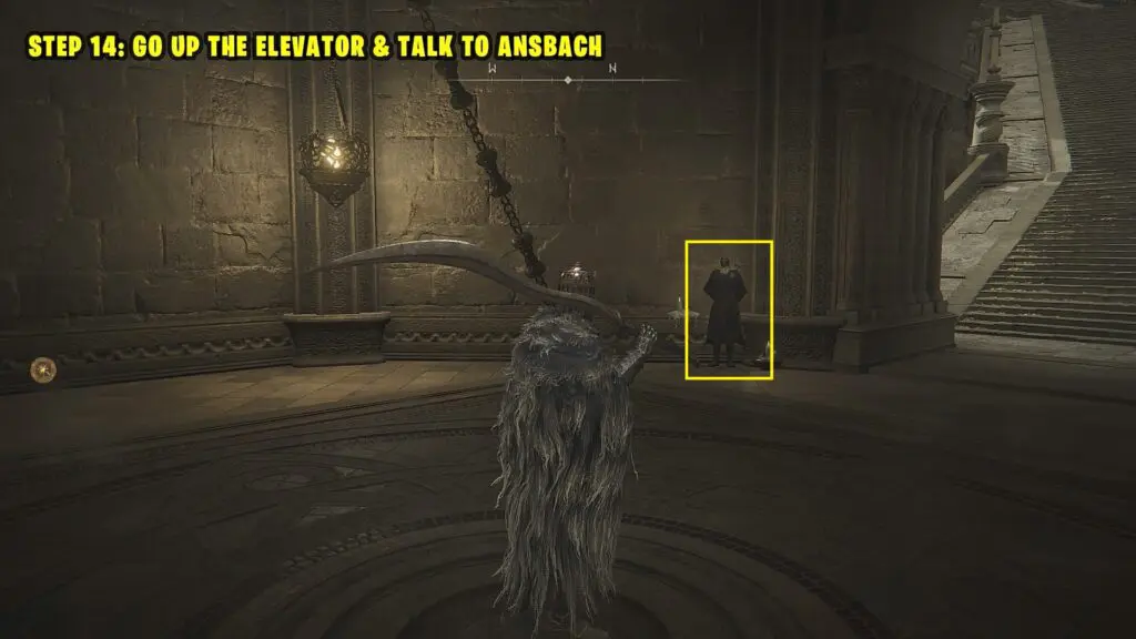 Talk to Ansbach near the Main Gate Cross Grace Site as shown in the picture below. If she is no longer there, then you will find him on the first floor of Shadow Keep (Refer to Step 4).