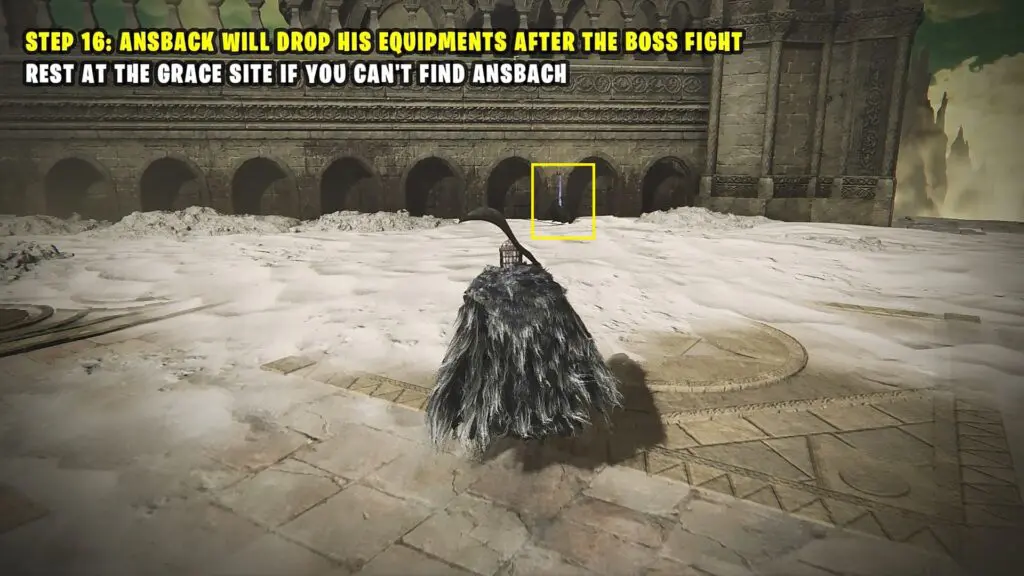 Ansbach will drop his equipment after the fight. Rest at the Grace Site if you cannot find his body. Collect Wise Man’s Mask, Ansbach’s Attire, Ansbach’s Manchettes, Ansbach’s Boots, Obsidian lamina, and Furious Blade of Ansbach from his body as shown in the picture below.