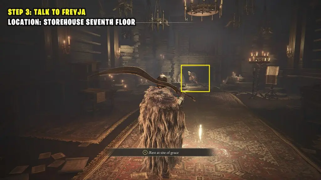 Go to the Storehouse, First Floor in Shadow Keep as shown in the picture below. Go north from the Grace Site into the next room and you will find Ansbach in the corner of a small library as shown in the second picture below. Tell Ansbach about Freyja’s decision. Talk to him until all the dialogues are exhausted.