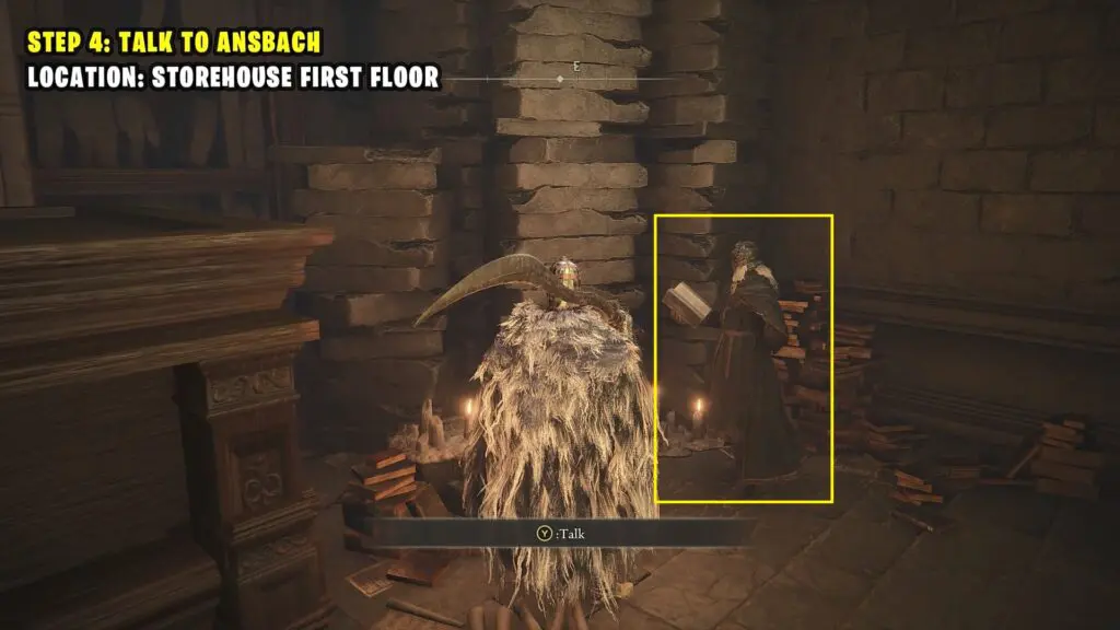 Go back to Ansbach at Storehouse, First Floor, and hand over the Secret Rite Scroll. Talk to him until all the dialogue options are exhausted.