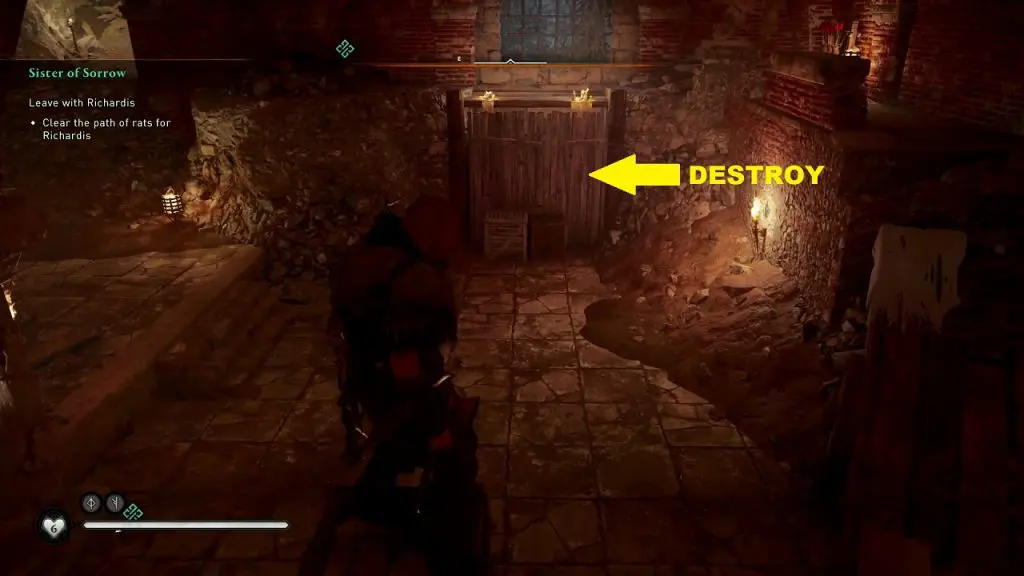 Once the rat swarms are taken care of, follow Richardis again until you come across a stone wall. Use explosives to break the stone wall to clear the path. Go outside through the broken wall to complete the quest.