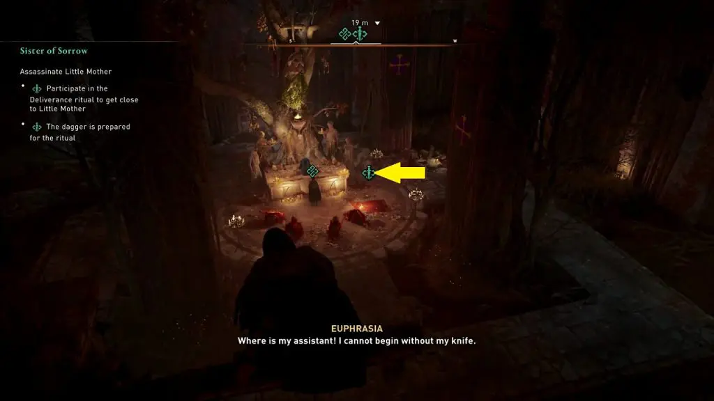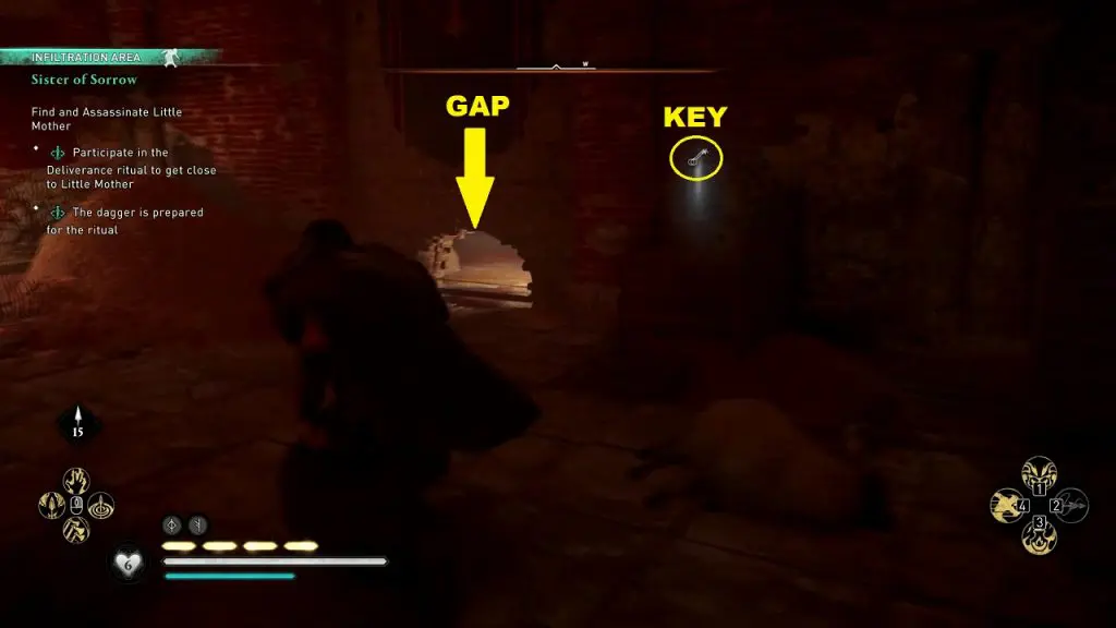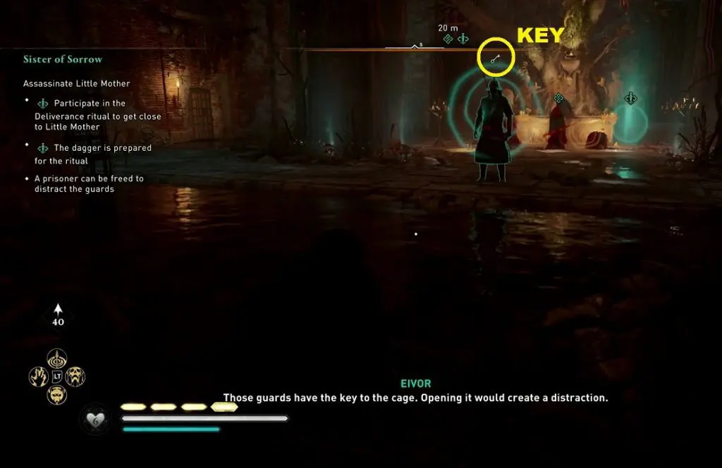As you reach Little Mother’s location, you can see a dagger symbol near her (See picture below). Interacting with the dagger symbol will start the deliverance ritual cutscene, where you will assassinate the Little Mother. But to start the deliverance ritual, you will first need to get rid of the soldiers. Kill the soldier with a key (See the second picture below). Use the key to open a cell containing a prisoner at the upper level of the ritual area. This will create a distraction and the soldiers will move away from Little Mother. Use the opportunity to go start the deliverance ritual and assassinate Little Mother.