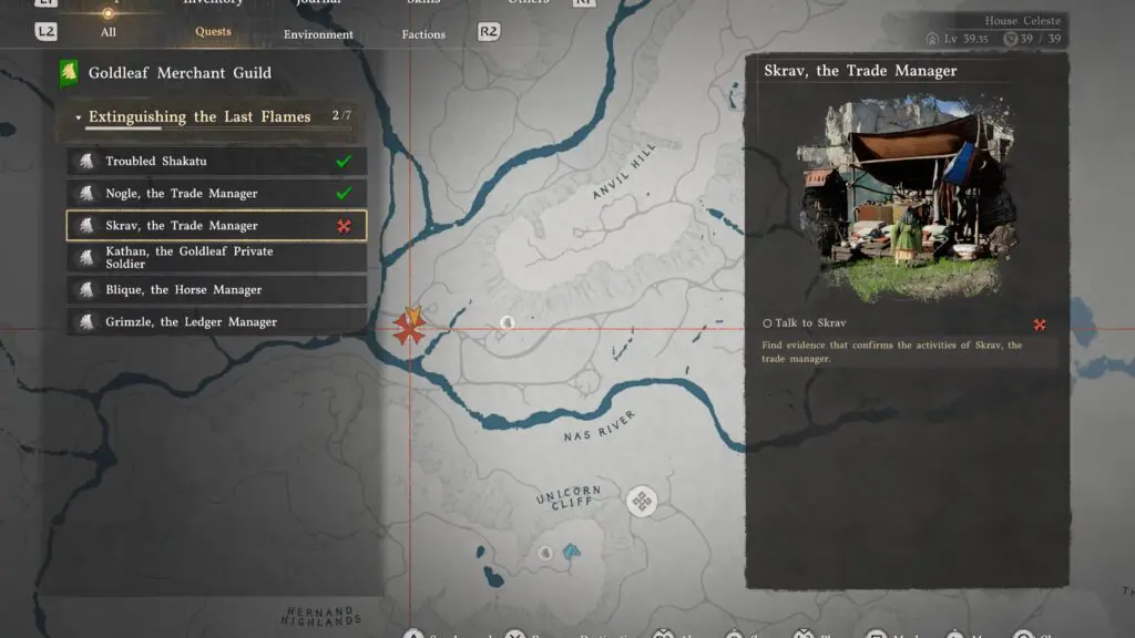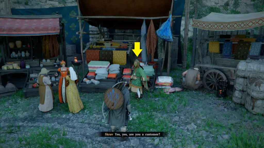 As you progress in the quest, you will need to speak with Skrav. Head to the Goldleaf Tradepost, located northwest of the Nas River. Once you arrive, look for a man wearing green clothes, standing alone at the shop. He is the trade merchant Skrav. Approach him and interact to start the conversation and move the investigation forward.