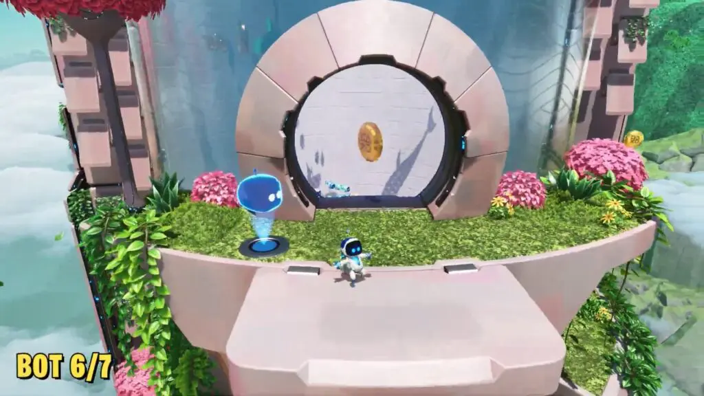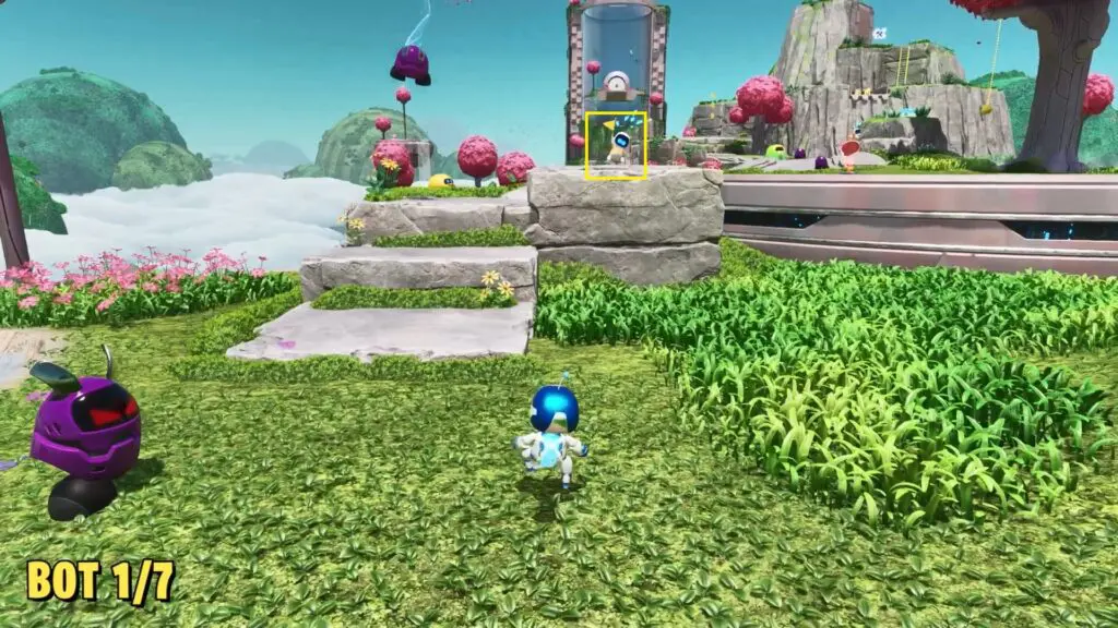 The first bot in the Sky Garden level is available at the start of the level. Proceed ahead along the path and look for a bot on top of the flat stone platform.