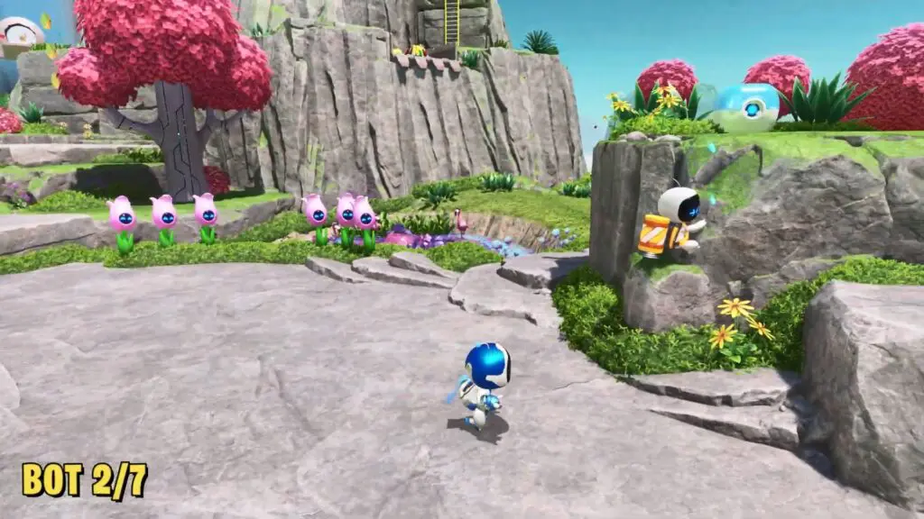 Continue forward from the last bot’s location, and you’ll spot the second bot clinging to the edge of a stone platform.