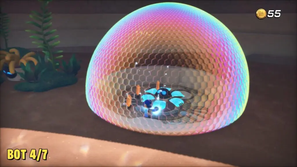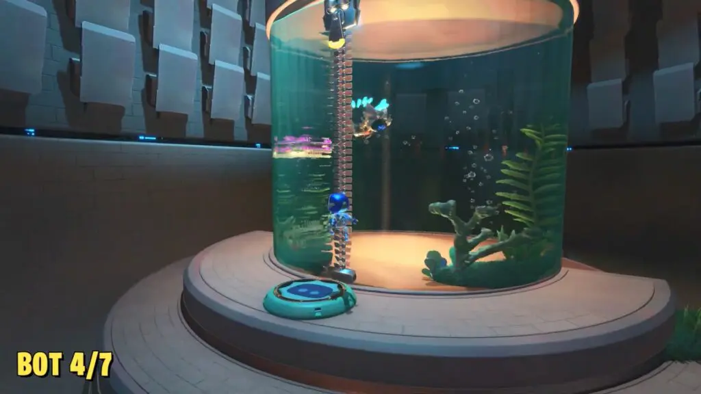 Climb up the tower behind the inflatable octopus you saw earlier during the flamingo puzzle. Enter the tower and go all the way down to find the bot inside an air bubble.