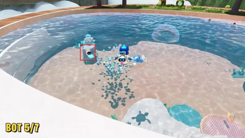 Head back into the pool and look for a bot that is paddling behind a turtle on a paddleboard.