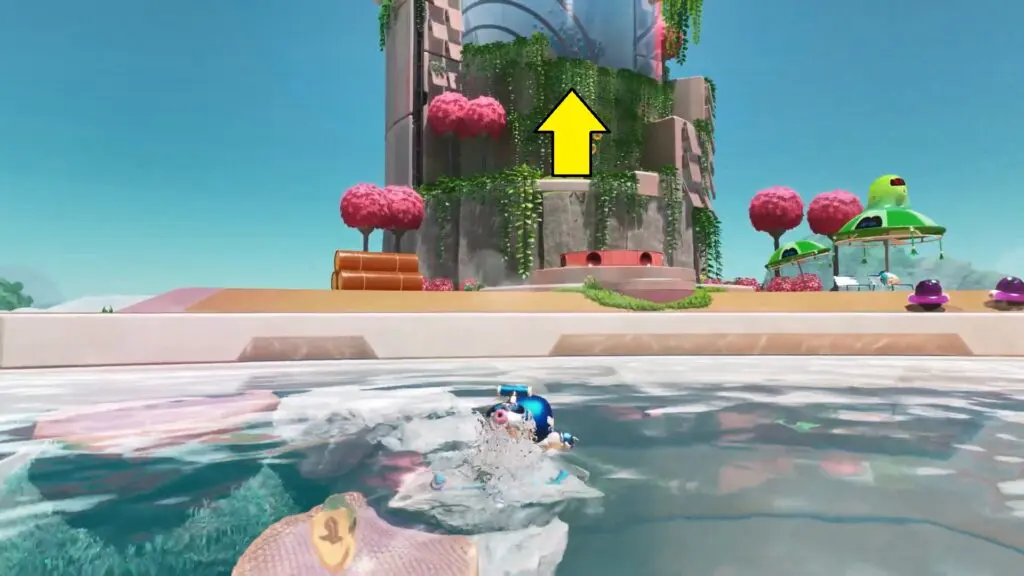Float back to the top of the water tube, then climb up the next platform. You’ll find a bot stuck inside a planter on the right side.