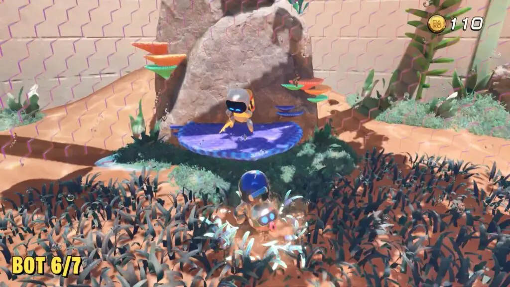 After rescuing the bot #3, use a spin attack on the flower bot to open a hidden path, then slide down to a pool of water.
