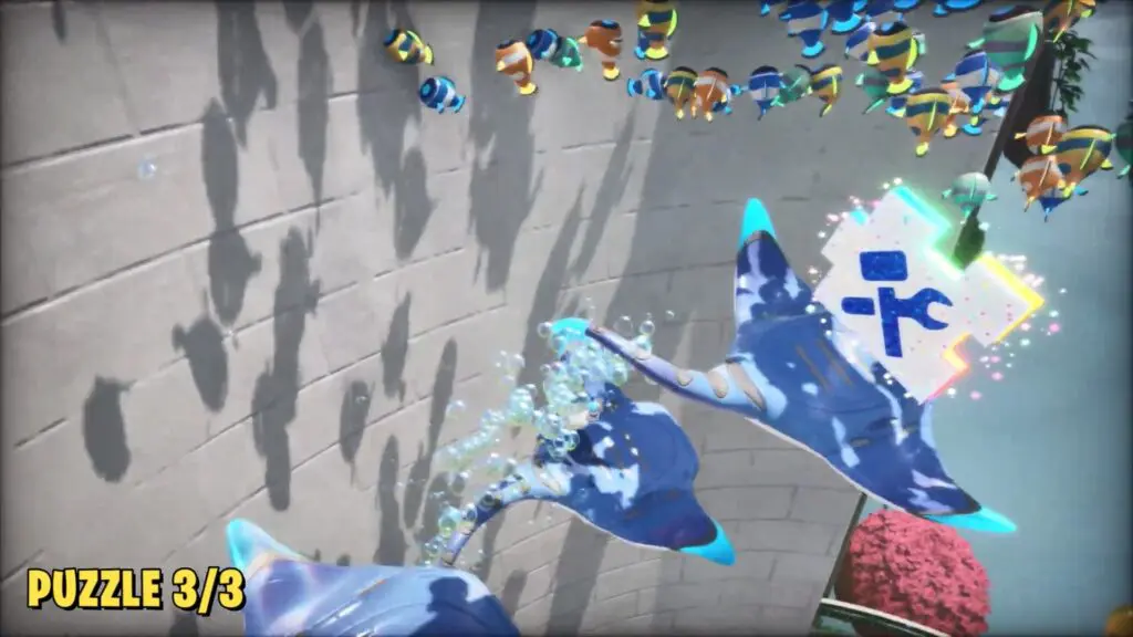 This puzzle is in the same water tube. First, float back to the top using your inflate ability, then dive back down into the tube to find the puzzle on the back of a stingray halfway down the tube.