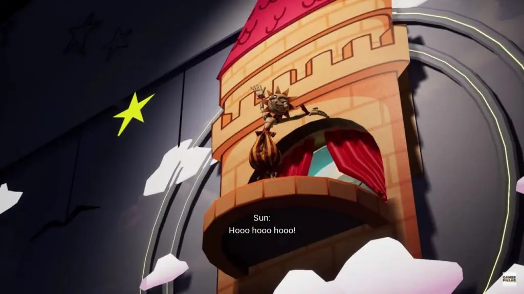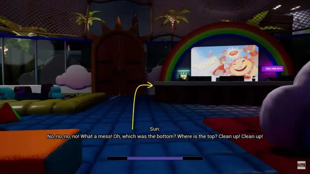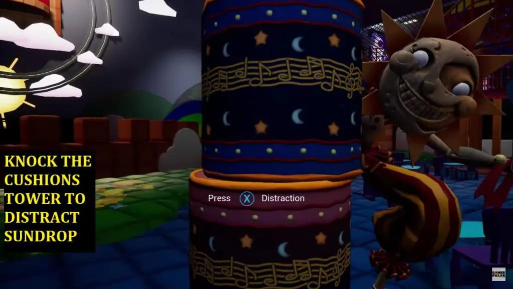 Sundrop will jump from a platform high above and come to talk. He won’t let you go off easily. Here you need to distract him by knocking over the towers of cushions as shown in below image. Here move in a way to bring towers of cushions in between you and Sundrop and knock it. This will distract him and he will start cleaning the mess, giving you ample time to run toward the security desk next to the large wooden door.