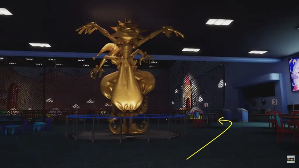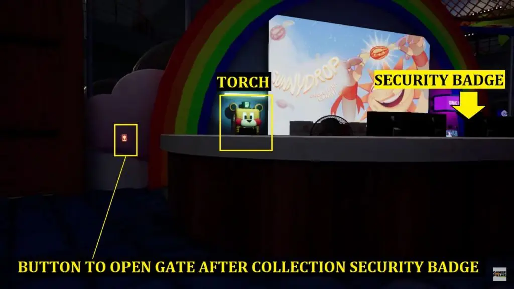This mission starts as you enter the Daycare. You will find yourself near the giant yellow-color Sundrop’s statue as shown below. Freddy informs you that he is unable to reach you and asks you to check for Security Badge at Security Desk to let him in.