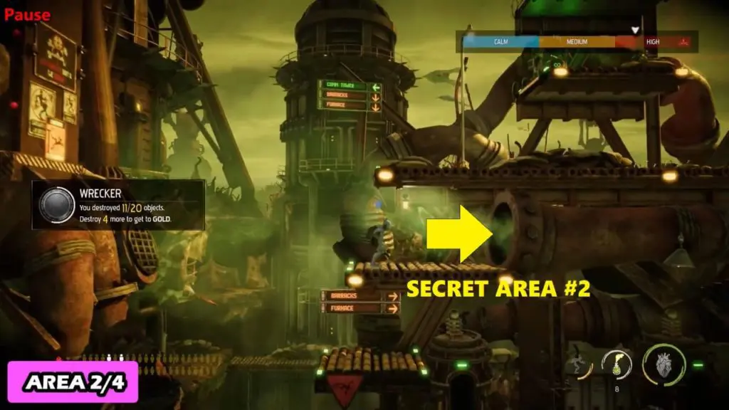 After coming out of the first barrack, you need to go in the left direction and continue your journey. Possess the last slig and use it to destroy the wooden platform and make the way clear for the below levels. Drop down a level and enter the pipe (see image) to find the Secret area.