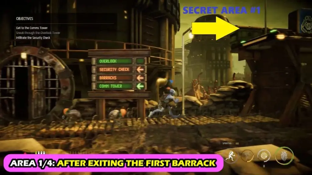 You can find the secret area after exiting from the first barrack. Out of the barrack, you need to go in the right direction. Then hop on to the first platform to the Secret area.