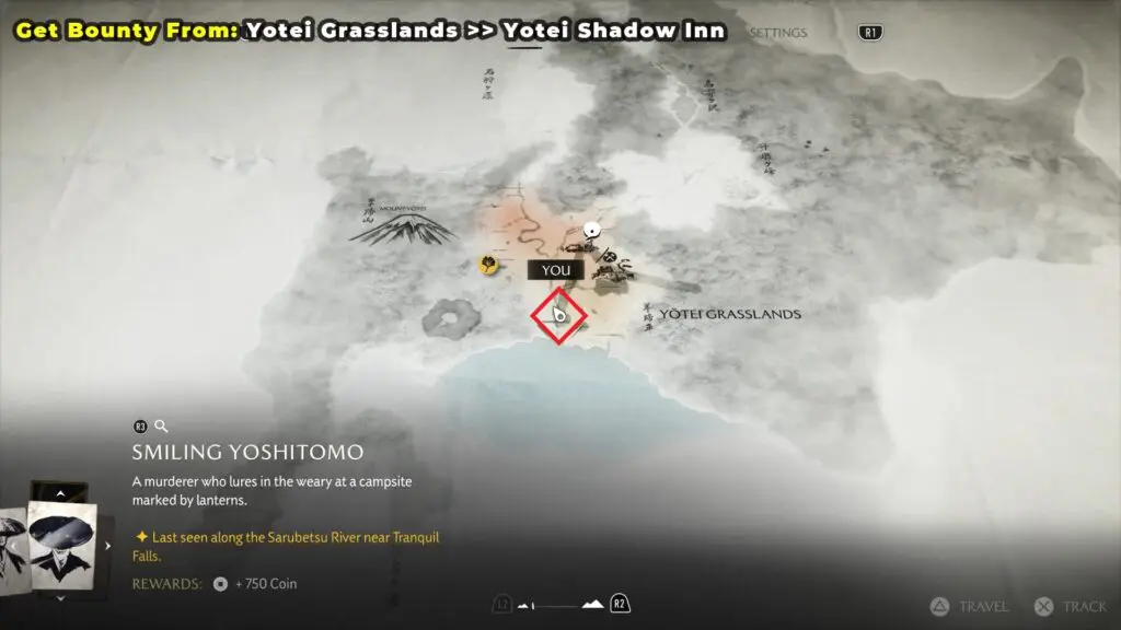You can start the Smiling Yoshitomo Bounty by visiting the Bounty Board at Yotei Shadow Inn in the Yotei Grasslands area. Interact with the board to see the list of available targets in the region, and select the Smiling Yoshitomo Bounty.