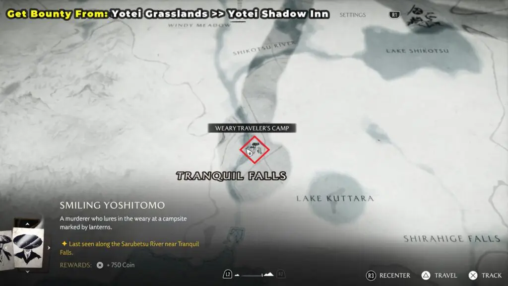 In this bounty, your objective is to hunt down the target Smiling Yoshitomo. Travel to the Weary Traveler’s Camp located near Tranquil Falls on your map.