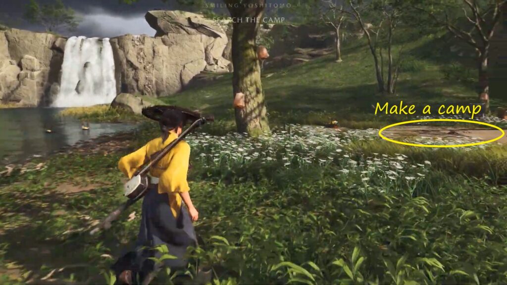 Set up camp beneath a tree to the right of the waterfall and rest there. Shortly after, an NPC dressed in white robes will approach and sit by your campfire.